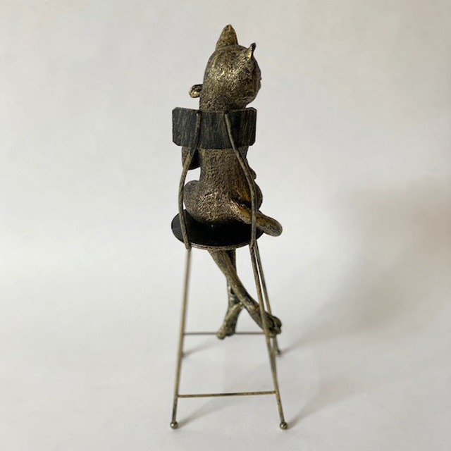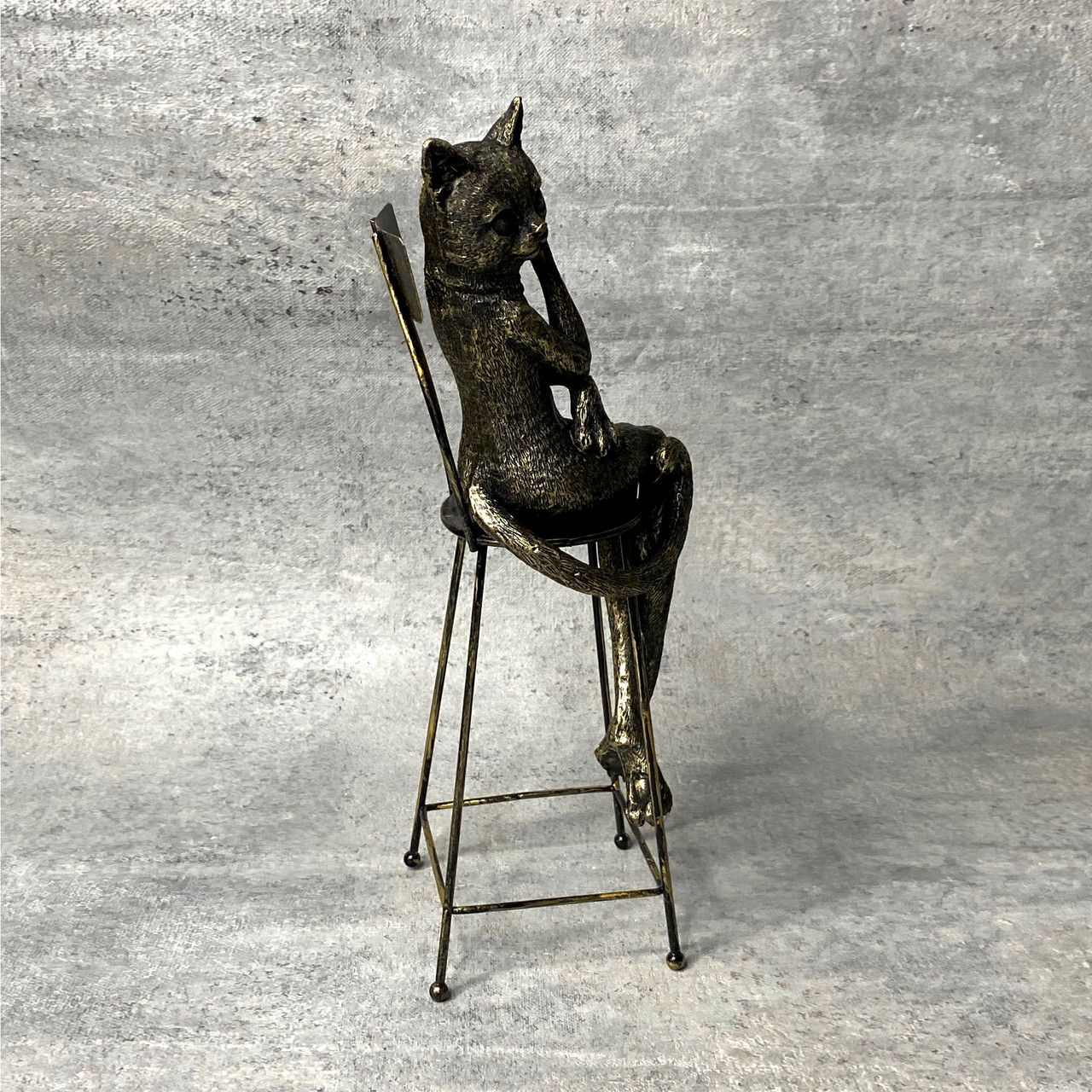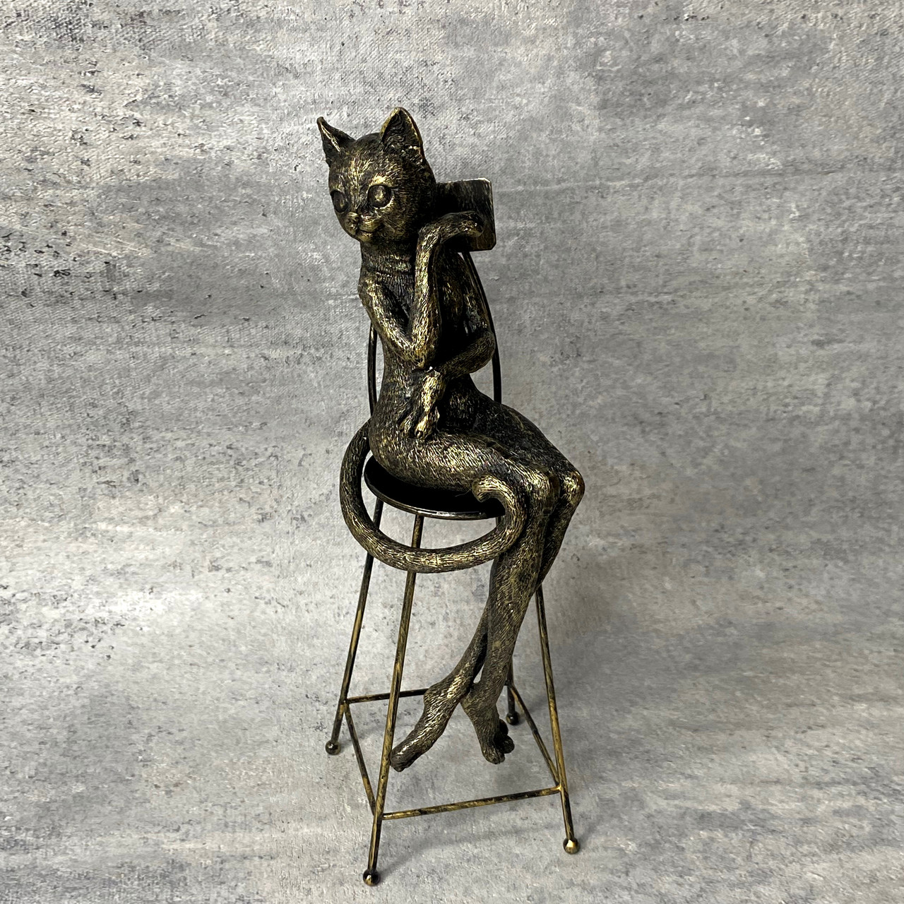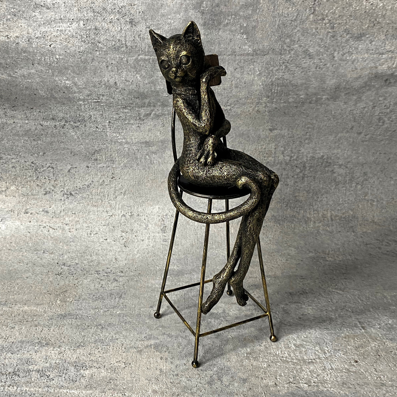 Необычная фигурка изящной кошечки, сидящей на высоком барном стуле. Чёрно-золотая масть, изящная поза, загадочный взгляд - ну чем не светская дама! Будет любить своих хозяев и приносить им удачу и благополучие! Отличный подарок для любителей котов и кошек и великолепный предмет декора.