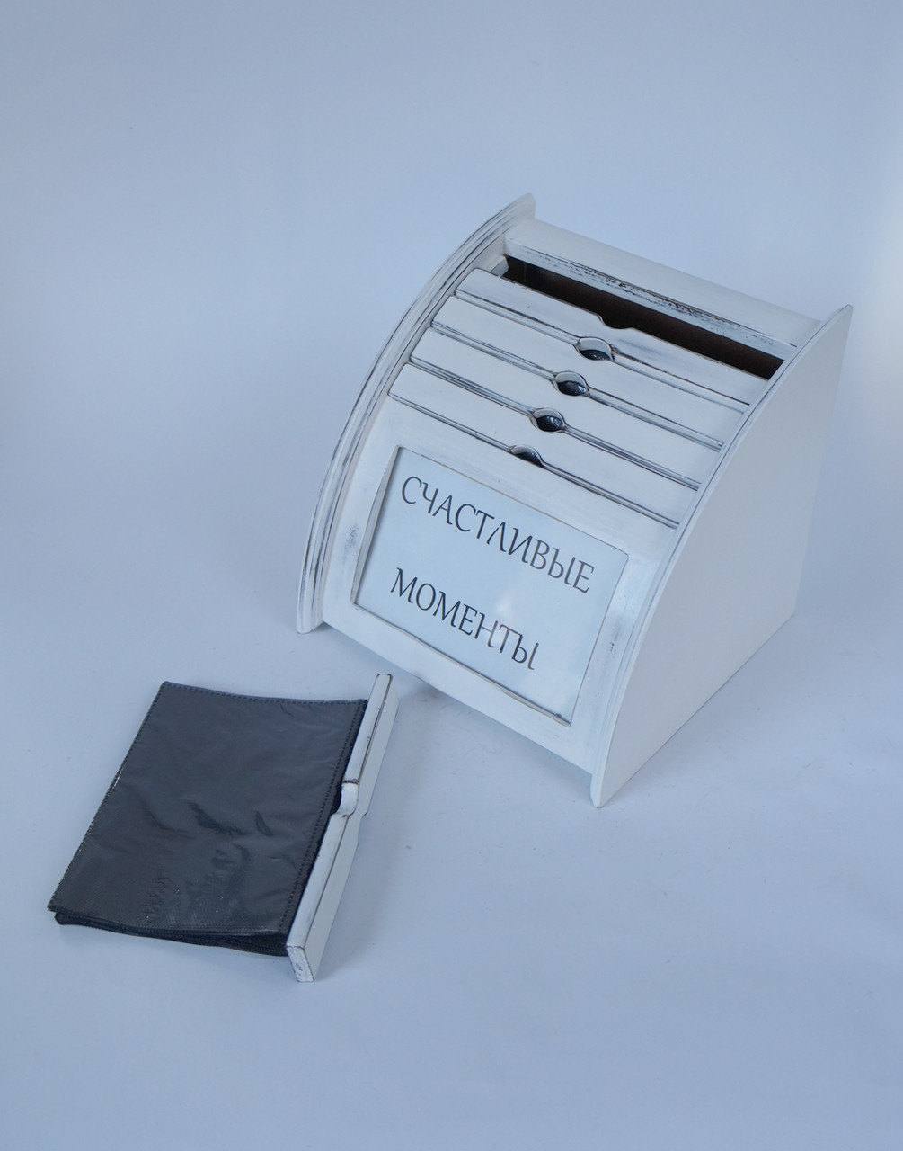 Фотоальбом - рамка для фотографий - отличная идея для подарка! А всё потому, что такой альбом не надо прятать в тумбочку. Он одновременно несёт в себе несколько функций - стоит на видном месте как рамка с самой любимой фоткой. А внутри, в файлах-книжках находятся ещё 100 фото, которые удобно посмотреть в любой момент. Этот фотобокс окрашен вручную в модном сейчас винтажном стиле. Лёгкие потёртости придают ему флёр старины, ощущение, что он достался Вам в наследство от бабушки. Такой предмет будет изюминкой любого интерьера, замечательным подарком для женщины, мужчины и даже для ребёнка.