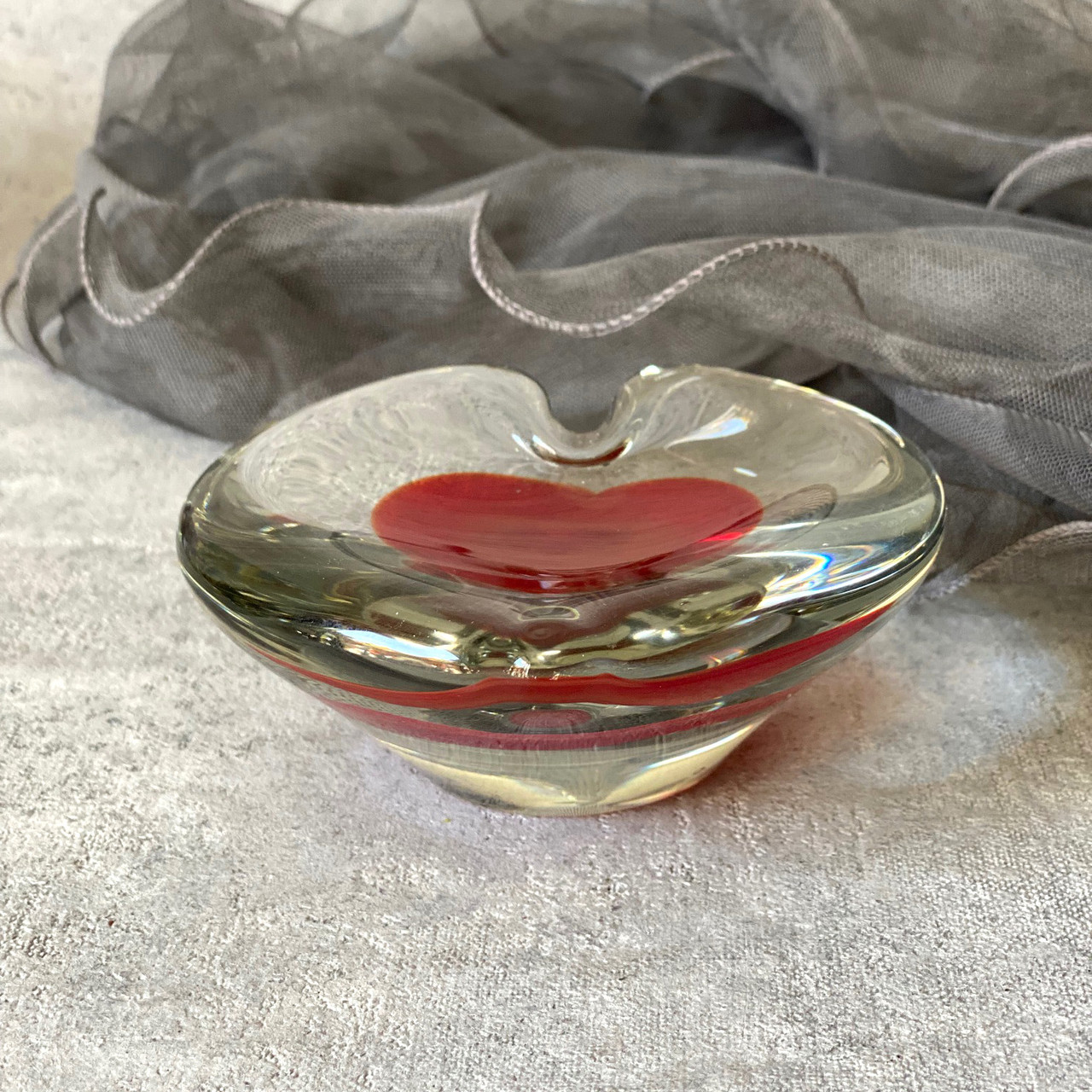 Оригинальная пепельница интересной формы. Она изготовлена вручную в 70х годах прошлого века на белорусской фабрике "Неман". Многослойное и разноцветное стекло перетекая друг в друга создаёт эффект свечения и производит неизгладимое впечатление. Пепельница Heart glass изготовлена в гутной технике (каждое изделие изготавливается мастером вручную из расплавленного стекла, так что сделать два одинаковых изделия просто не возможно). Такая штучка будет действительно VIP подарком для самого привередливого человека, ценящего уникальность и стиль. Пепельница является музейным экспонатом фабрики "Неман"