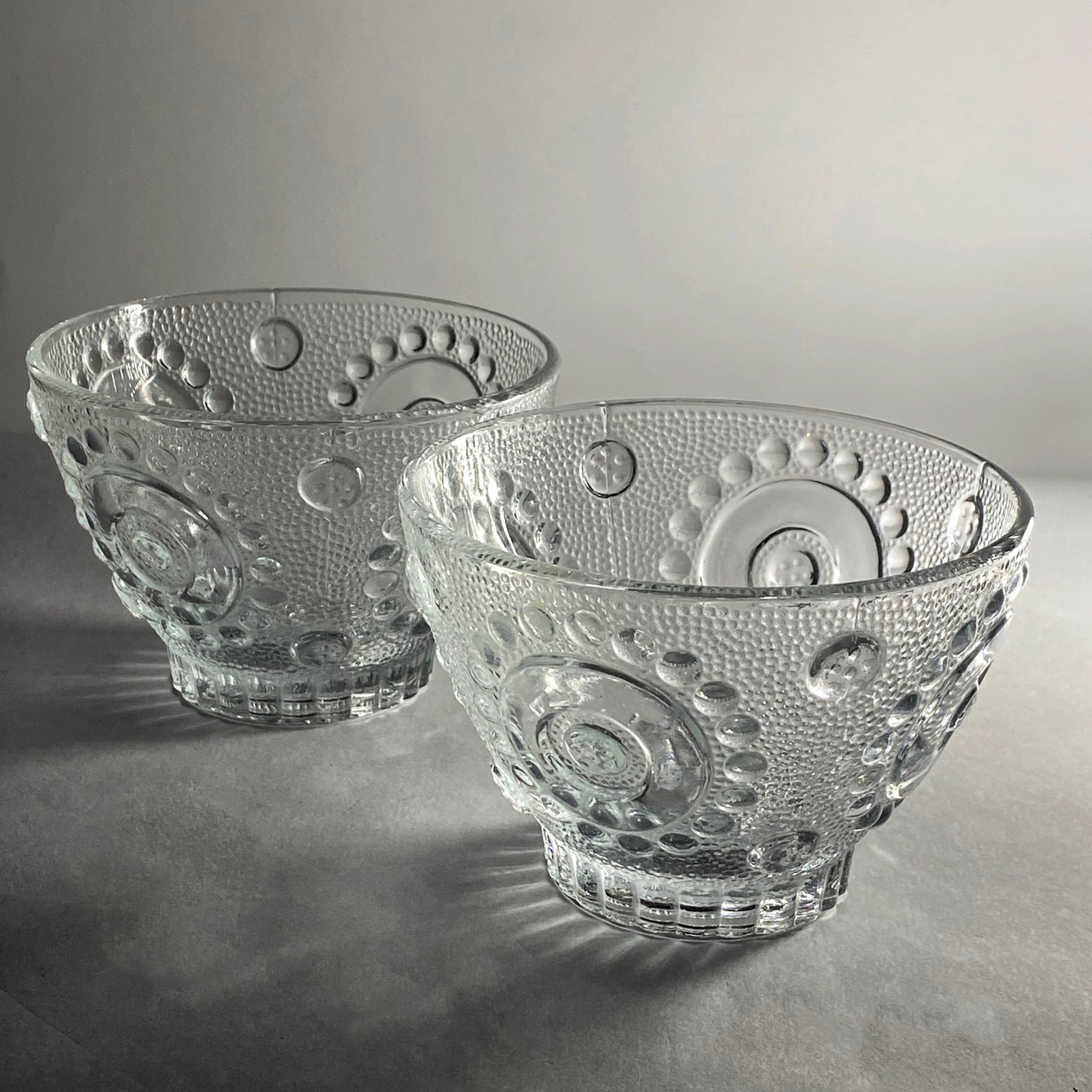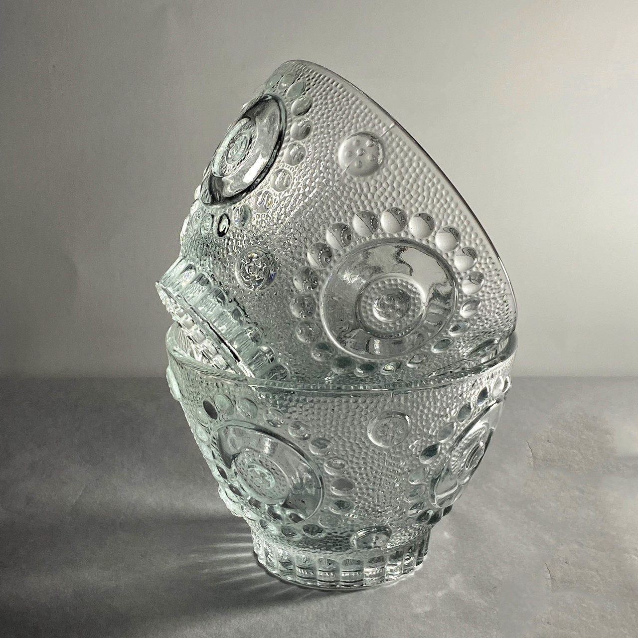 Нежная сияющая салатница родом из 70 гг. прошлого века родом из СССР. Салатница сделана как ремейк к производимой в то время в Чехословакии посуде из прессованного стекла- очень похожая форма и почти идентичный узор. Салатница достаточно тяжёлая. Состояние - как новая, витринное хранение.