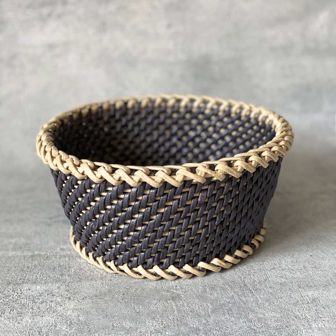 Оригинальная плетёная корзинка для фруктов, выпечки, можно использовать для всяких мелочей. Полностью сделана вручную. Оригинальное плетение из бумаги, очень крепкое и плотное, можно мыть водой. Размеры: диаметр верхней части 22 см, диаметр дна 17 см, высота 10 см.