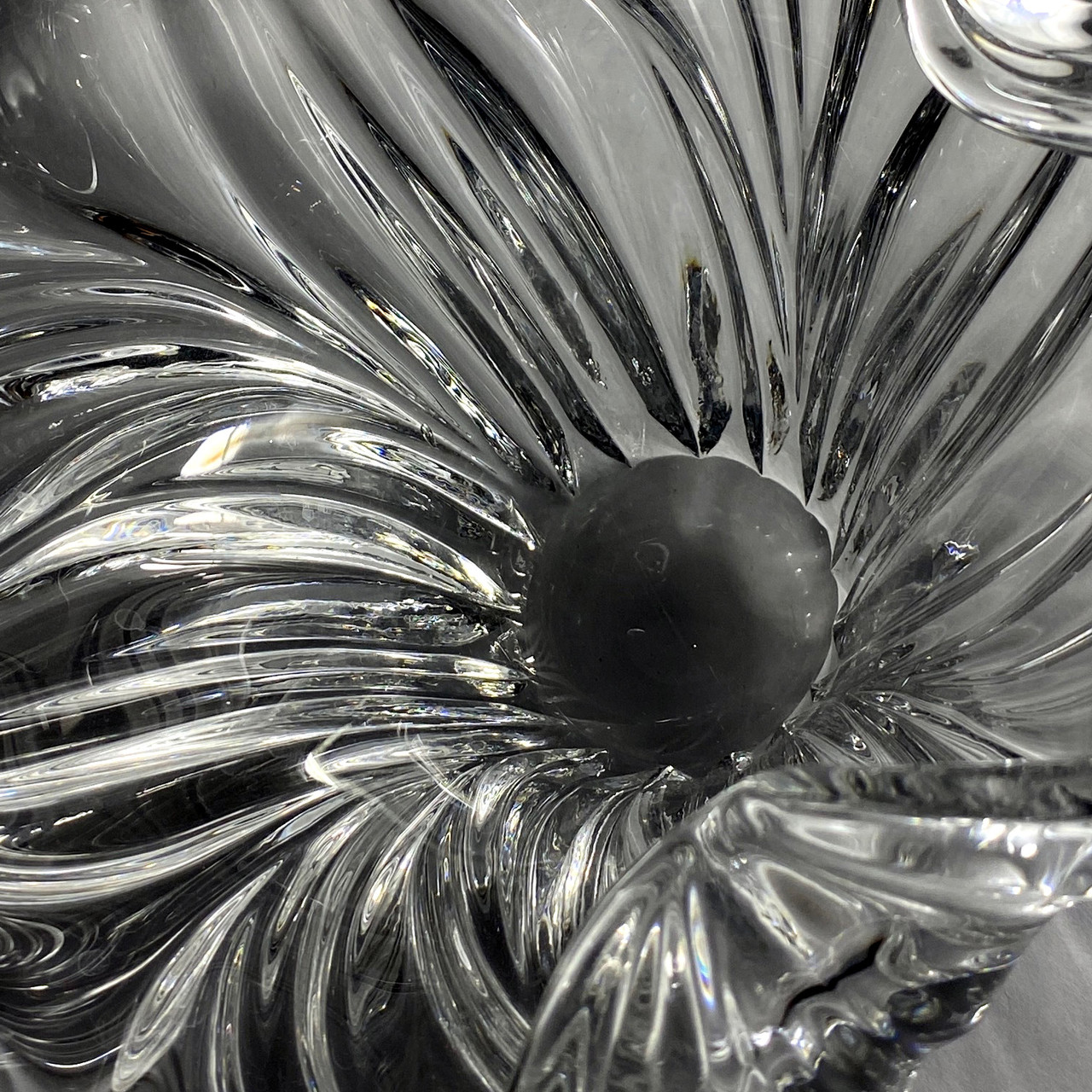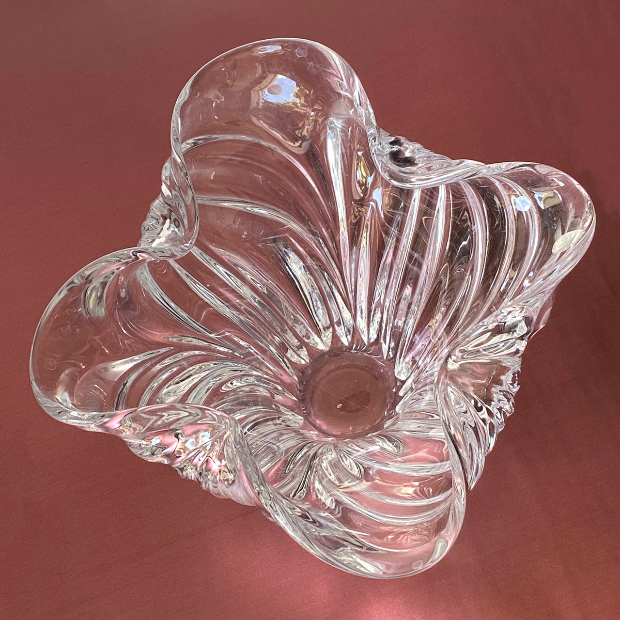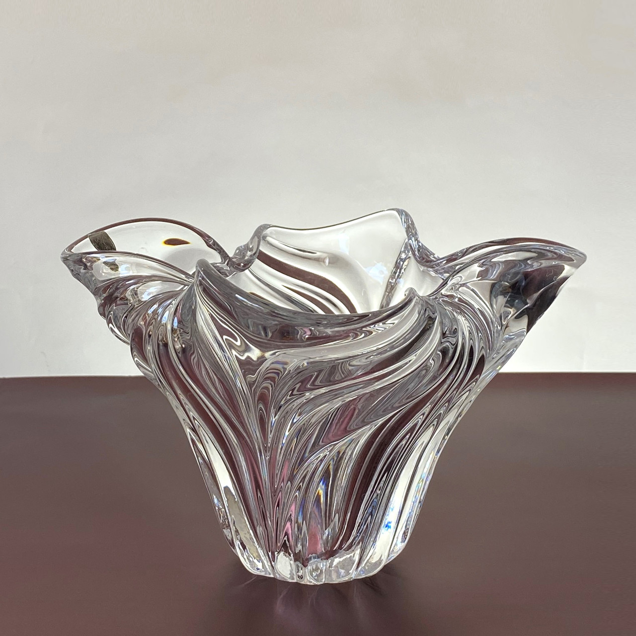 Ваза из бесцветного хрусталя, сделанная в 70х гг. прошлого века на Ленинградском заводе художественного стекла. Автор Х.М. Пыльд. По своей форме она действительно напоминает причудливый цветок, а её плавные гибкие линии ассоциируются с водной стихией. Высота вазы 14,5 см, ширина - 23,5*24 см. В вазе будут великолепно смотреться не только тюльпаны, но и конфеты, фрукты. Отличный подарок для ценителей прекрасного и уникального даже в мелочах.