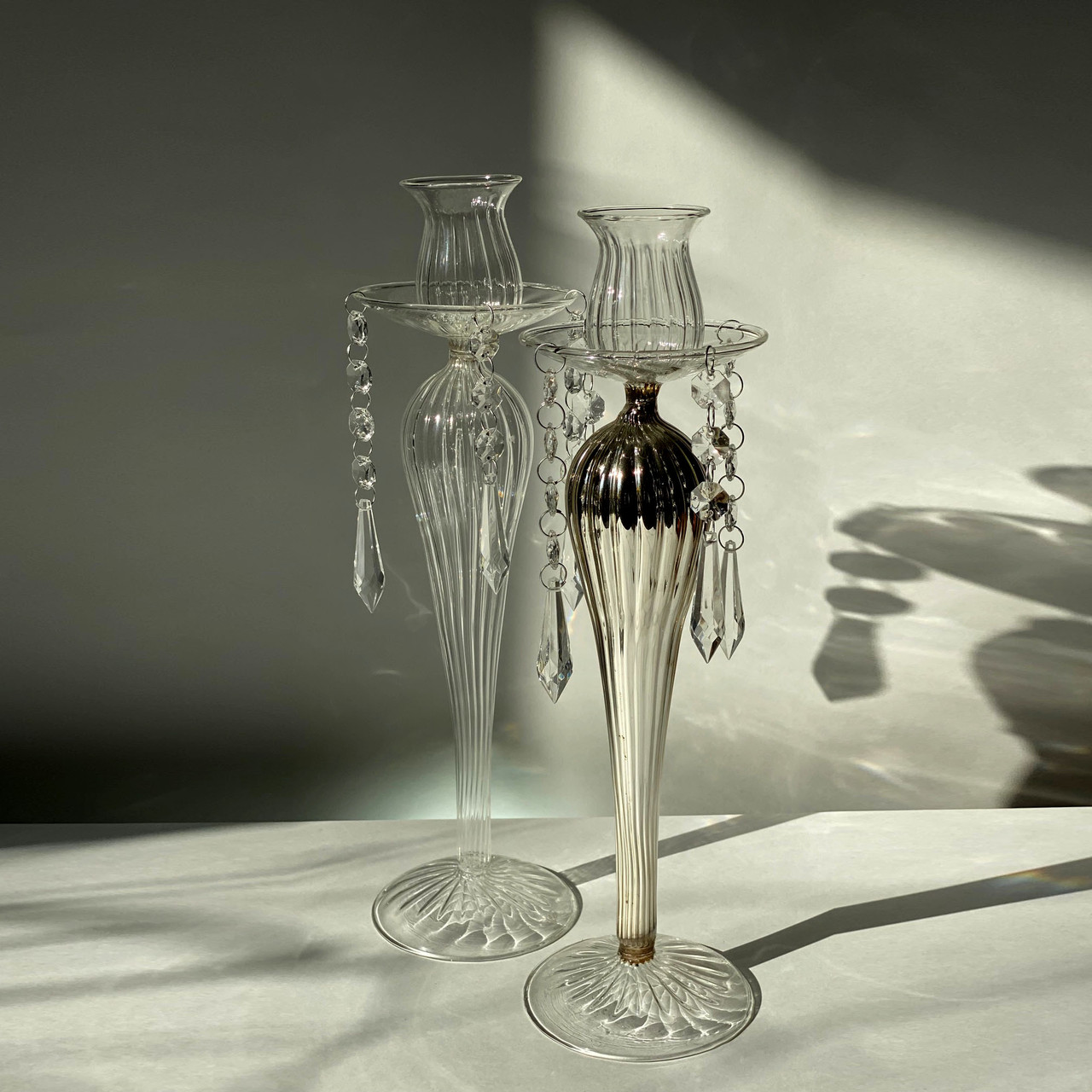 Оригинальный винтажный подсвечник для столовой свечи, два вида. Один полностью прозрачный. Второй покрыт зеркальным напылением внутри ножки. Необычайно лёгкие и воздушные как по весу так и по фактуре. Подсвечники не атрибутированы. Предположительно конец прошлого века. Подвески мелкие сделаны из акрила, крайняя длинная подвеска - стекло.