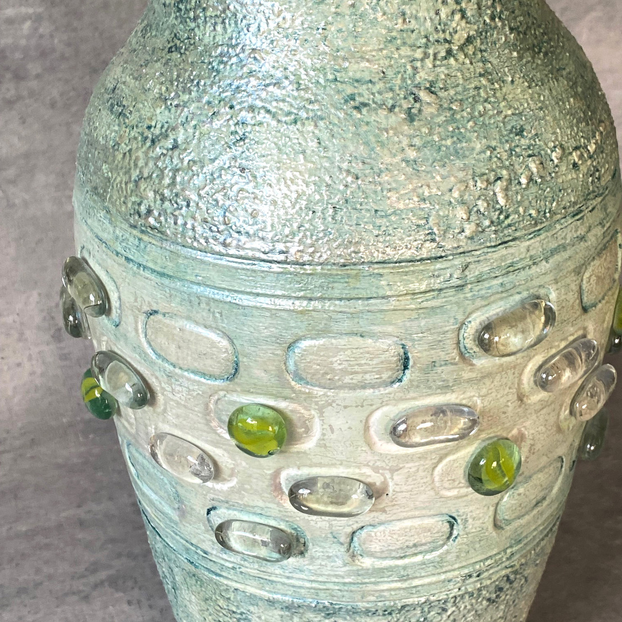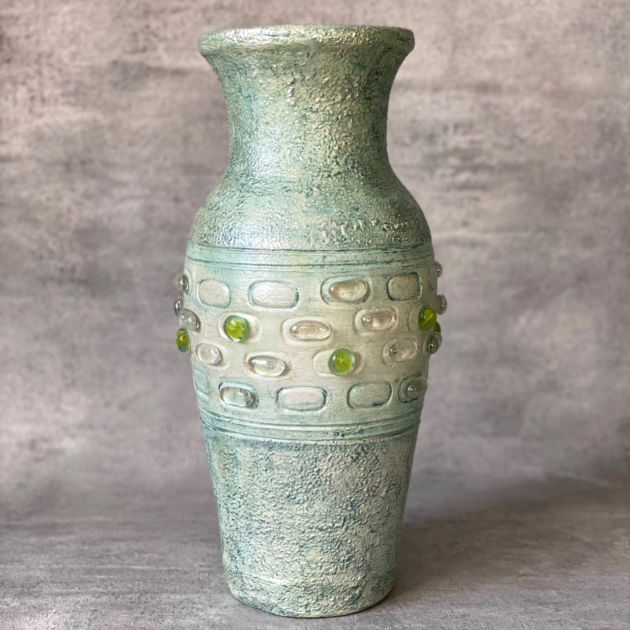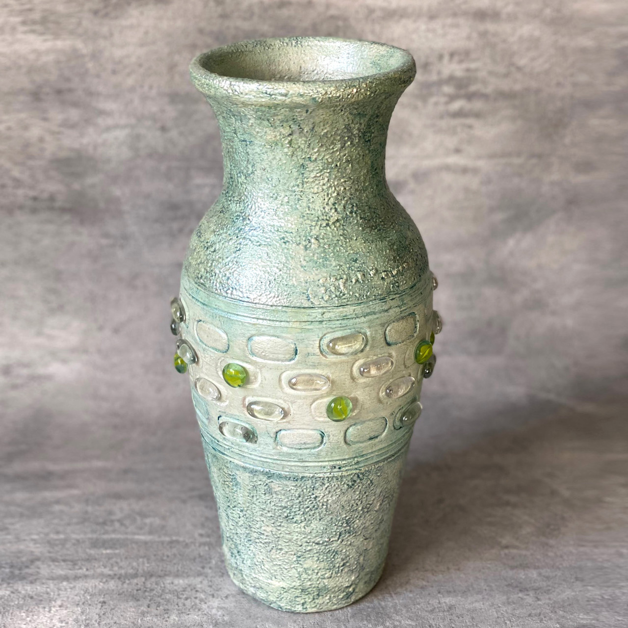 Нежная, но одновременно акцентная высокая ваза, цвета салатового жемчуга, полностью сделана и декорирована вручную. Единственный экземпляр. Повтора не будет. Вазу можно использовать для срезанных цветов, наливать в неё воду. Размеры: высота 41 см, диаметр в самом широком месте 19,5 см, диаметр горловины 15 см, диаметр дна 12 см. Отделка - меловые краски, патины, водостойкий лак, стеклянные кабошоны.