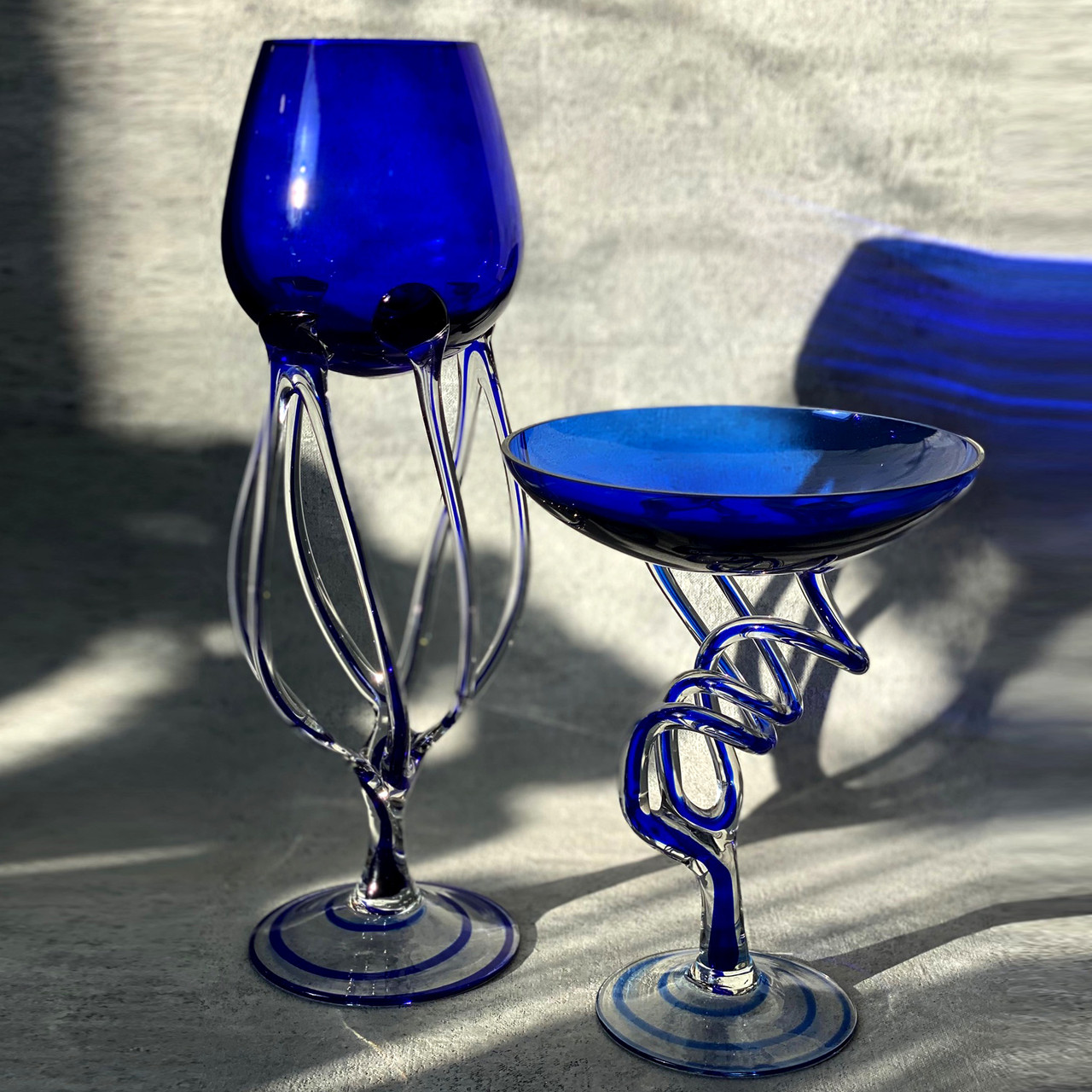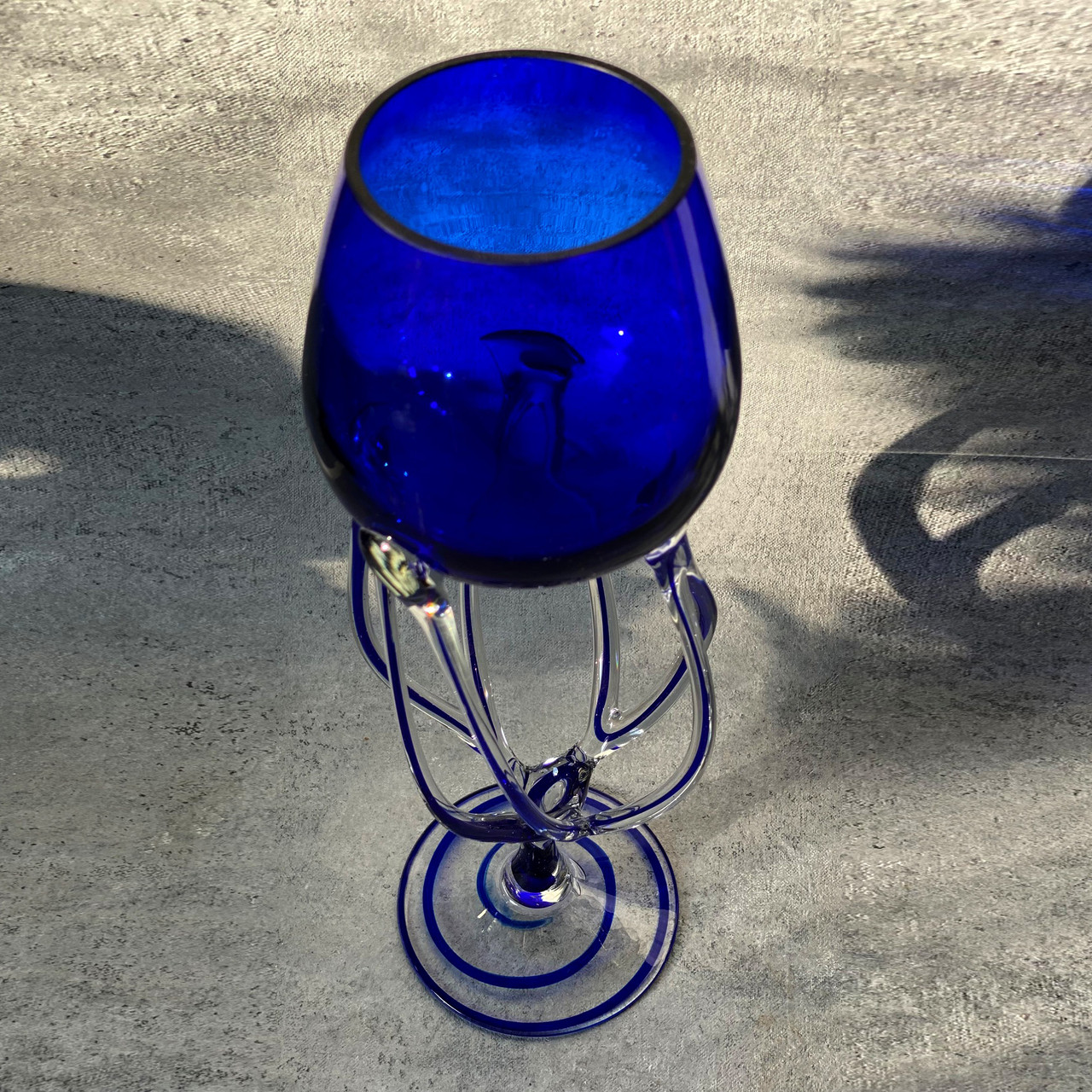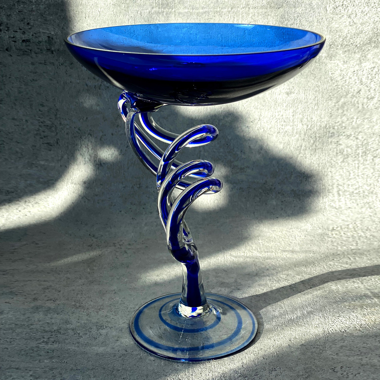 Воздушная, как будто невесомая ваза-подсвечник родом из 80х прошлого столетия. Изготовлена на польской фабрике Makora, которая не работает уже больше 15 лет. Ваза полностью сделана вручную из нескольких слоев стекла. Глубокий синий цвет практически переходящий в ультрамарин, оттеняется прозрачным на необычной, искусно переплетённой ножке.