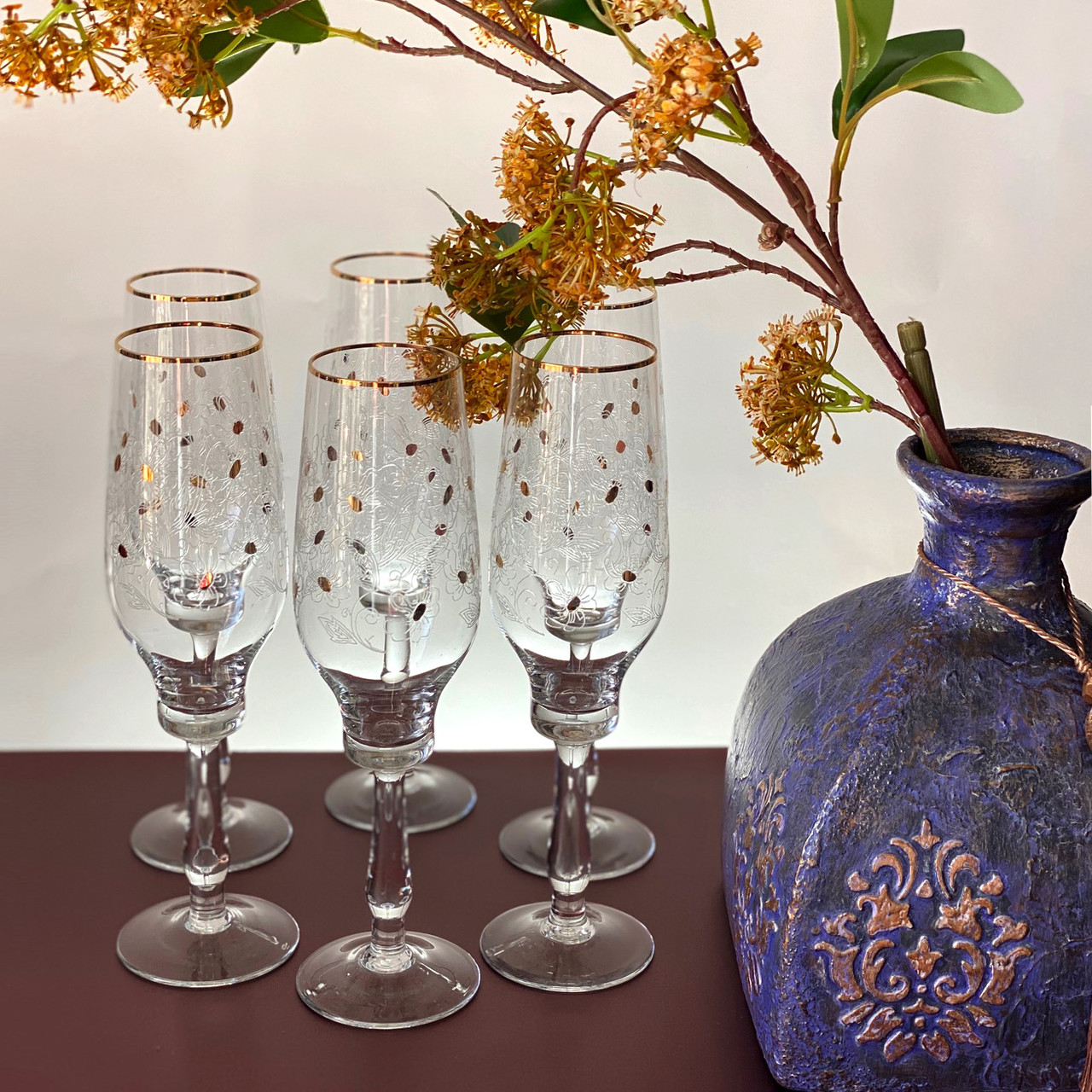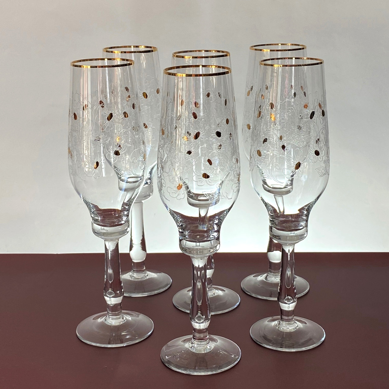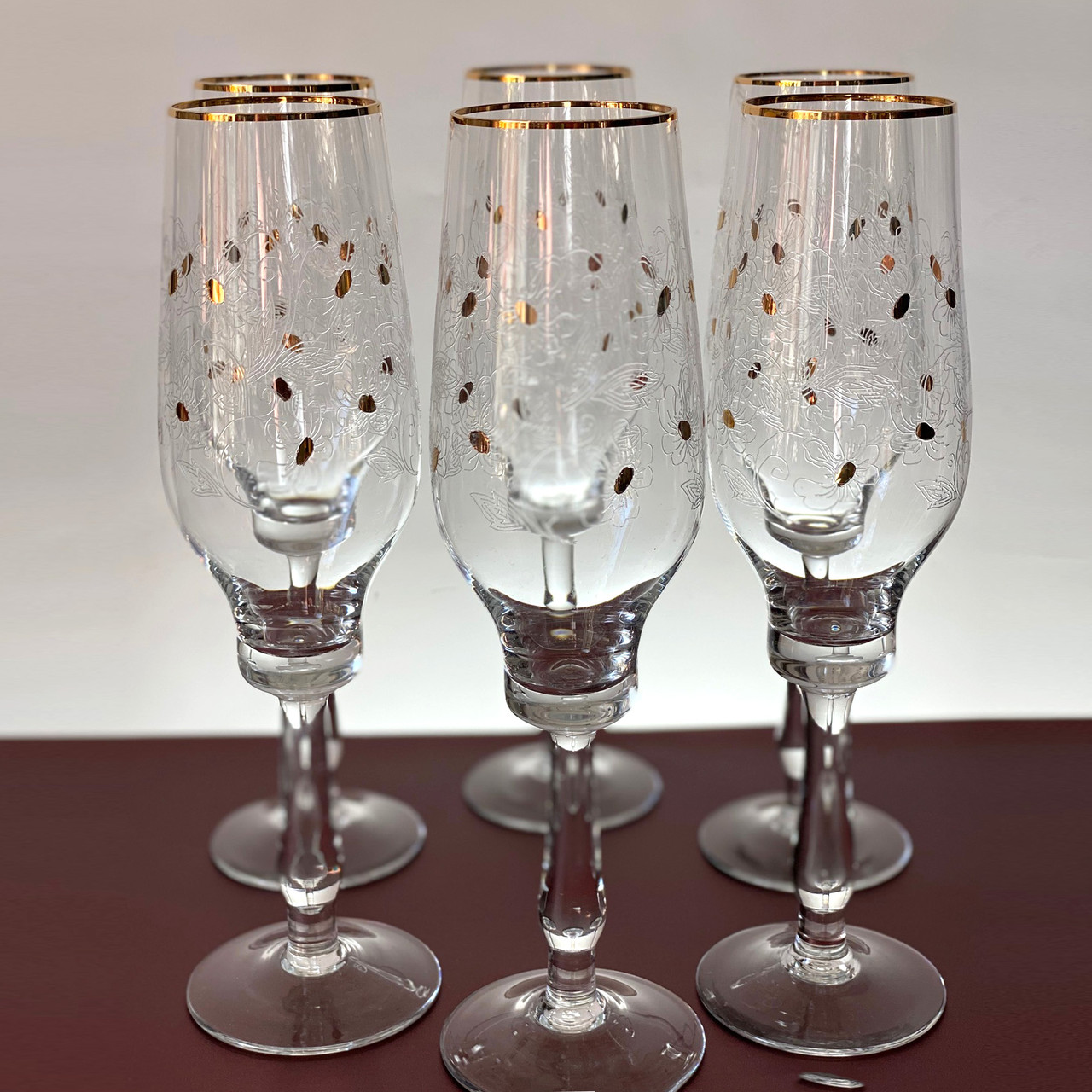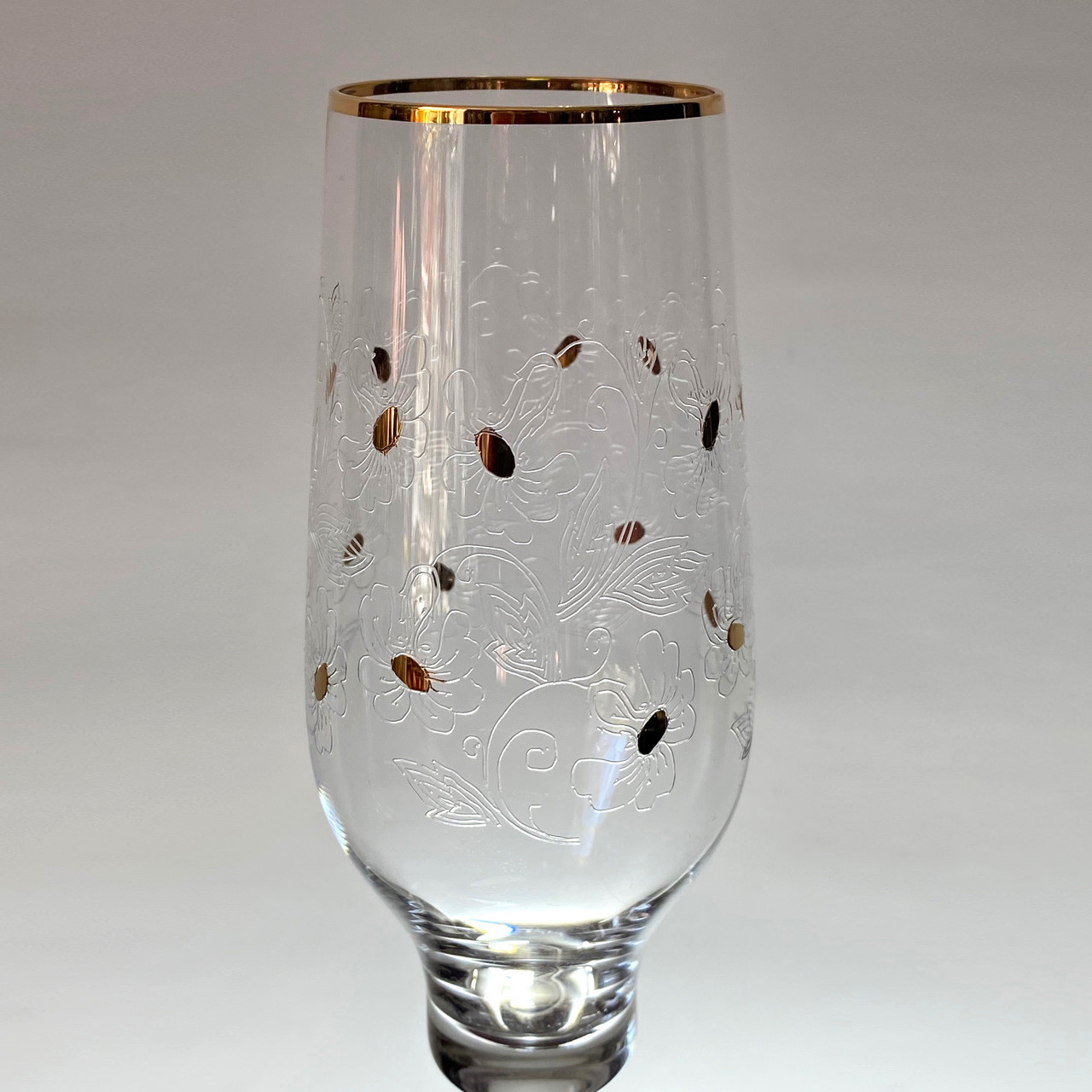 Когда видишь эти фужеры, эпитеты в стиле " роскошные, сказочные, волшебные" совсем не кажутся выспренными и чрезмерными. И они действительно шикарные! Невероятно тонкие, лёгкие, сделанные из абсолютно прозрачного хрустального стекла, на который методом пантография нанесена искуснейшая гравировка с цветочным мотивом, а золотые пятнышки напоминают серединку цветка! Фужеры очень редкие. Сделаны в Чехословакии в 60х годах прошлого века.