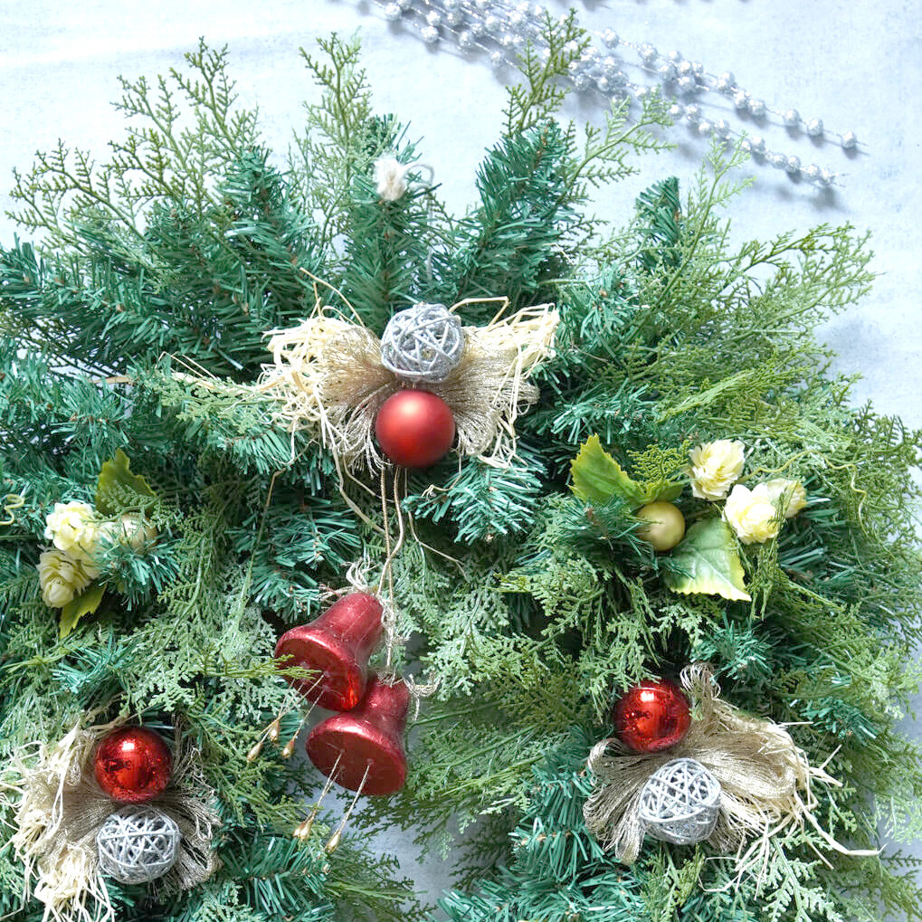 Декоративный новогодний венок на дверь или стену из веток ели и туи. Венок декорирован шарами из ротанга, стекла и пластика, бантами из рафии. Выглядит роскошно и необычно. Очень массивный и пушистый. Размеры:высота 90см, ширина 70 см.