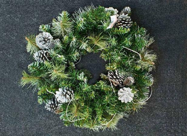 Венок искусственный из веток сосны и ели на стену, декорированный серебряными шишками. Размер ― диаметр 45 см. Очень массивный и пушистый.
